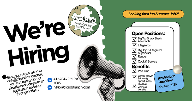 Cloud 9 Ranch is always seeking fun, energetic, positive minded individuals to join our ranch crew! We offer above average hourly wages, paid Holidays, vacation, 401k, Medical, Dental, Vision, and Life Insurance, as well as several other supplemental coverages. If you are looking for a great place to work, you found it! Apply today. We can't wait to speak with you! For More information or questions about employment, please reach out to Nikki with our Human Resources Department at 417-284-7321 Ext. 1005 or email at nikki@cloud9ranch.com