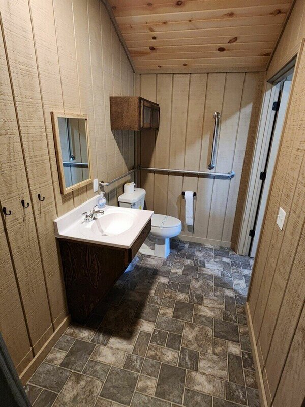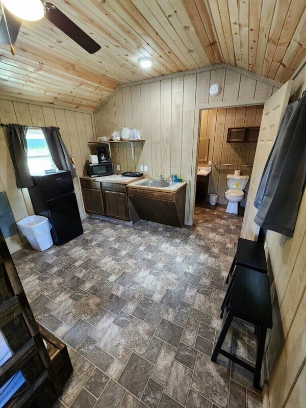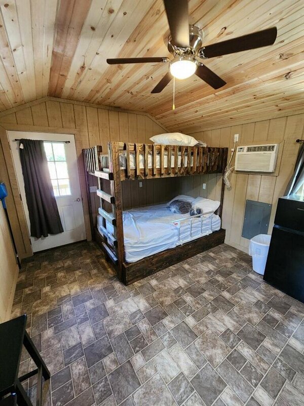 Cabin 46 is reserved for customers with disabilities. It has a queen bed with bunks, kitchenette, dishes, mini fridge, and a full bath.