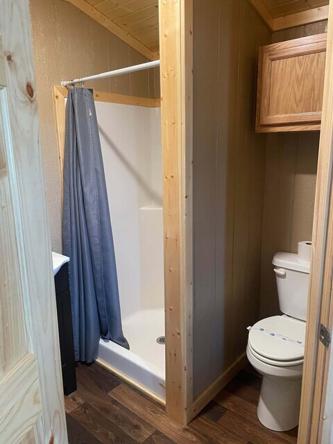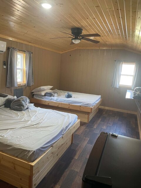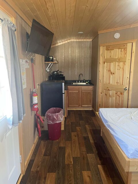 Hill Country 50 has two queen beds, linens, towels, dishes, a kitchenette with a mini fridge, full bath, flat-screen TV, and free high-speed Wi-Fi. All Deluxe Cabins have a private bathroom which includes a full-size tub/shower unit. **NO PETS-NO SMOKING**